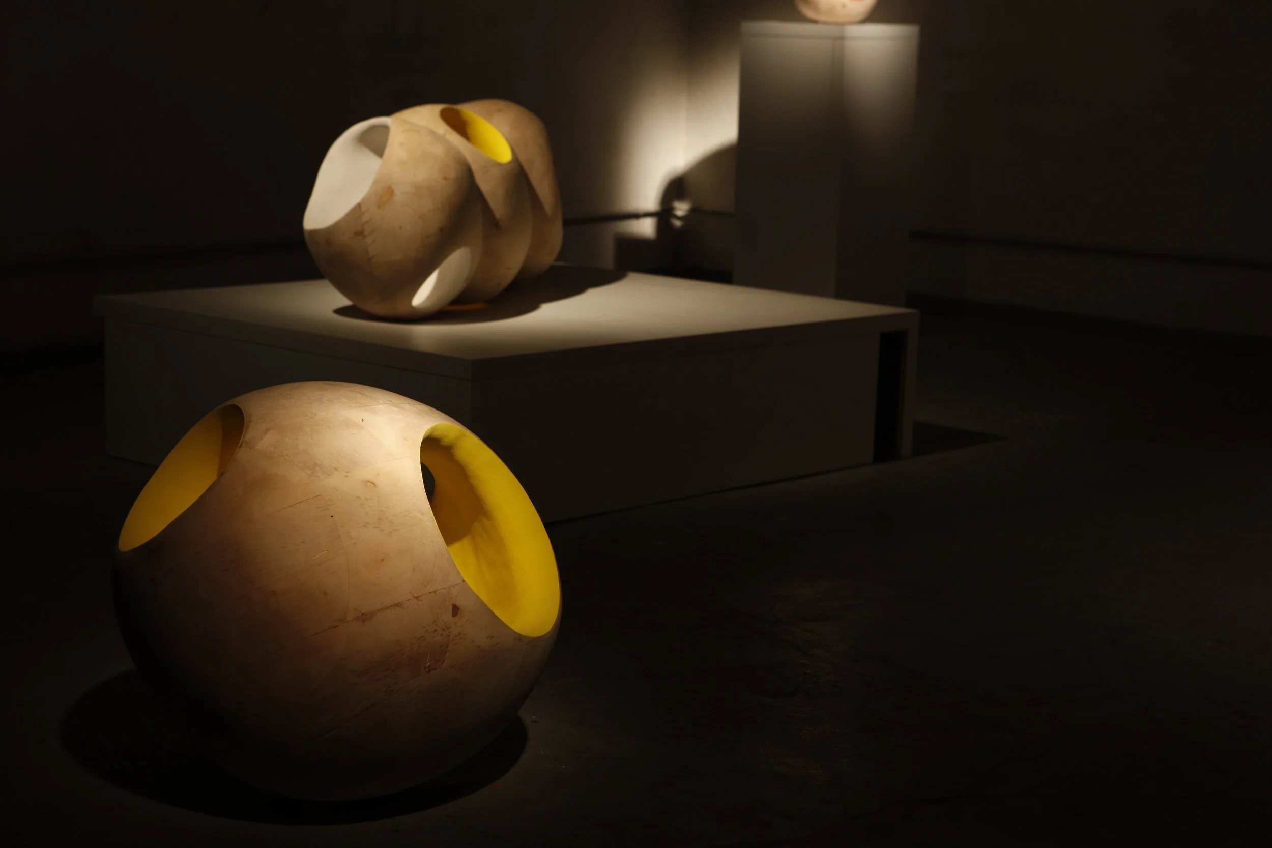 The Calabezas exhibition, installed in the Urg3l studio, Madrid, presents the exhibition of wood and inks. Photographed by Denis Pushkin